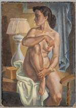 Huib de Ru (1902-1980), zittend vrouwelijk naakt bij schemerlamp, olieverf op board, verso gesigneerd -punaisegaatjes, randslijtage-, 40 × 28 cm