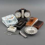 Divers kleingoed, waaronder: aardewerk inktpot, klokje met barometer en thermometer -ornamentje bovenop ontbreekt-, 19e-eeuws schildpad doosje -defecten-, en metalen schaaltje
