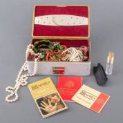 Bijoudoos met diverse bijouterieën, waaronder Majorica parelcollier