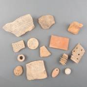 Diverse bodemvondsten, waaronder: Romeins bouwkeramiek, Italisch, 1e tot 4e eeuw n.Chr.; haardtegel, 16e eeuw; en (weef)gewichten, vermoedelijk Klein-Azië, hellenistisch/Romeins, herkomst: oud-directeur Museum Kam, Nijmegen