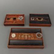 Drie diverse houten inktstellen, elk met messing greepje en glazen inktpotje, één met aardewerk strooier, 19e/20e eeuw -gebruikssporen en defecten-, grootste 25,5 × 16 ,5 cm