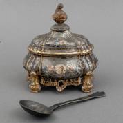 Geribde tôle peinte tinnen tabakspot, aan weerszijden gedecoreerd met portretten en profil in medaillons, het deksel met een greep in de vorm van een vlam, Louis Quinze -beschildering sleets-, 17,5 × 15 × 10 cm, daarbij: tinnen lepel met ronde bak, 18e eeuw, 18 cm lang