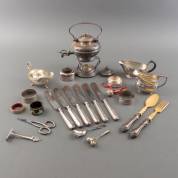 Divers verzilverd en onedel, waaronder: bouilloire, twee diverse sauskommen, twee rammelaars en divers bestek