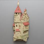 Beschilderd houten fantasiekasteel, de voorgevel openklapbaar, met oog voor wandmontage, 97 × 36 × 22 cm