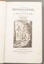 Drie delen: Gelaatkunde - Lavater, J.C, Over de physiognomie. Deel 1-3. Amsterdam, J. Allart, 1781-1784. 3 delen (van 4). Half leer uit de tijd, rode en groene rugschildjes. Met 37 platen en meer dan 200 gegraveerde vignetten en illustraties - slijtagesporen aan de banden; lichte watervlekken in deel 3-