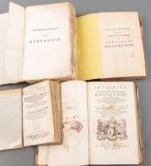 Vier boeken: Meetkunde - Dou, J.P. ('der stadt Leyden Lant-meter ebde wijnroeper'). 'De eerste ses boecken Euclidis. Overgheset, verklaert ende uytgheleyt. Van nieuws oversien'. Rotterdam, 1632. (XVI) 228 pp. Kl.8vo. Perkament; J.J. Blassière, 'Inleiding tot de beschouwende en werkdaadige meetkunde in het landmeeten, waterpassen enz.' 1777. 2 delen. Gebonden. Met 14 uitslaande platen; P. Steenstra, 'Grondbeginselen der meetkunst. 8ste druk, overgezien en verm. door M.I.S. Bevel'. 1820. 544 pp. Gebrocheerd. Samen 3 complete werken -de banden, vooral van de tweede titel, in slechte staat-