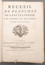 200 gegraveerde platen (waarvan 67 dubbelbladig): afbeeldingen van ambachten uit de Encyclopédie méthodique (uitgebreide versie van de Encyclopédie van Diderot en d'Alembert). Deel 1. Paris, Liège, (1783): 4to. Kartonnage uit de tijd. NB 25 dubbelbladige platen tonen 'Caractères et alphabets de langues mortes et vivantes' -band en platen los, lichte watervlekken-, 39 × 22 cm
