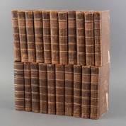 21 delen: Wagenaar, Jan. Vaderlandsche historie, vervattende de geschiedenissen der Vereenigde Nederlanden, inzonderheid die van Holland, van de vroegste tyden af. Amsterdam, I. Tirion, 1770-1790. 21 delen. Half kalfsleer uit de tijd (deel 1: nieuw half linnen). Met gegraveerde titel, 6 uitslaande kaarten, 41 gevouwen platen en 91 portretten -banden langs de randen versleten; licht gebruind en lichte watervlekken-