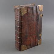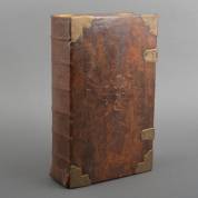 Biblia, dat is de gantsche H. Schrifture (met de Apocryphe Boecken). (Saten-Generael vertaling). Haerlem, J.A. van Beverwyck, 1687 (adres ontnomen aan de titel van Nieuwe Testament). Folio. Blindgestempeld kalfsleer over houten platten, 8 messing hoekstukken en 2 klampen -titel ontbreekt, laatste blad beschadigd- Mooi voorbeeld van een oude bijbelband, 35 × 23 cm
