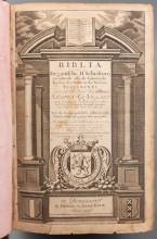 Biblia, dat is de gantsche H. Schrifture. Met de boecken genaemt Apocryphe. Dordrecht. P. en J. Keur, 1736. Folio. Leder uit de tijd over houten platten, koperen hoekstukken en twee klampen. Met gegraveerde titel en 11 platen, ieder met 6 Bijbelse gravures -rug vakkundig vernieuwd met leder, nieuwe schutbladen; alle bladen gebruind-, 36 × 24 cm