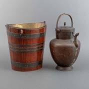 Koperen hengselkan en mahonie thee-emmer, beide 19e eeuw -deuken en defecten-