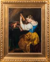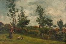 Martinus van Andringa (1864-1918), kippen voeren, olieverf op paneel, l.o. gesigneerd en gedateerd 1883, 17 × 24,5 cm