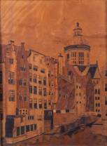Max Hony (1911-1992), ingelijst houten stadsgezicht van Amsterdam, Oudezijds Kolk en Sint Nicolaaskoepel, inlegwerk van verschillende soorten hout, verso met annotatie: 'Max Hony in ballingschap 1 mei - 6 augustus 1943', jaren '20, 42 × 30 cm, er is nog een tweede versie van dit inlegwerk bekend, gedateerd 2 juni 1943, die hij tijdens zijn onderduikperiode heeft gemaakt