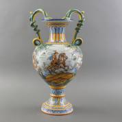 Hoge majolica vaas met slangenoren en polychroom decor van een ruiter in landschap, gemerkt 'Talabricense Talavera', 20e eeuw, hoogte 66,5 cm