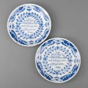 Paar Delfts aardewerk pannenkoekbordjes met blauw wit decor en de tekst: 'Der will ist gut die Gab ist klein - Gott Weiss dass ich's von herzen mein -1730', voor de Duitse markt, 18e eeuw, enkele randschilfers, Ø 22 cm