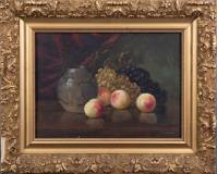 Hollandse School: stilleven met potje, druiven, en perziken, olieverf op board, r.o. gesigneerd W. Schippers, 20e eeuw, 28 × 39 cm