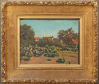 Schilderij: gezicht op een groentetuin met boerderij in het verschiet, olieverf op paneel, niet gesigneerd, 20e eeuw -lijst te groot voor schilderij-, 28 × 35,5 cm