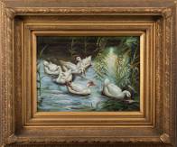 Schilderij: eenden bij het riet, olieverf op paneel, r.o. gesigneerd S. Bowl, eind 20e eeuw, 35 × 45 cm