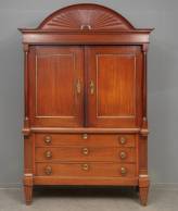 Mahonie kabinet met bronzen beslag, en uitschuifbare planken achter de twee deuren, Engeland, 19e eeuw -beschadigingen aan het fineer, de zijkanten van de lades beschadigd-, 202 × 130 × 56 cm