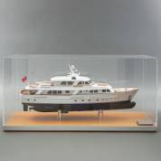 Scheepsmodel van het 34 meter motorjacht 'Cornelia', ontworpen door DeVries Lentsch, in plexiglazen display -boeg beschadigd-, 39 × 80 × 28 cm