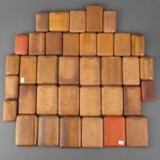 Twee vierpas tegeltableaus: polychroom pompadour decor, en decor van granaatappels met druiventrossen, gemonteerd op houten plaat, eerste helft 17e eeuw, circa 26 × 26 cm