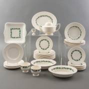 Aardewerk serviesdelen, model Edme, decor Stratford, uitvoering Wedgwood, Engeland, bestaande uit: negen dinerborden, vijf diepe borden, drie ontbijtborden, negen taartbordjes, twee diepe ovale serveerschalen, vleesschaal, vierkante serveerschaal, twee kommen, ovale serveerschaal, en eierdop. daarbij zes ontbijtborden, model Windsor, en ongedecoreerde theepot Edme, dinerbord Ø 26 cm