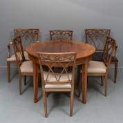 Ronde notenhouten tafel met uitklapbaar blad en zes bijbehorende stoelen met stoffen bekleding, waarvan twee met leuningen, de rugleuningen met gekruiste spijlen en open snijwerk -één spijl is gebroken, de onderdelen zijn bijgevoegd, bekleding is sleets-, tafel Ø 108 cm