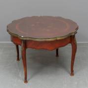 Padoek- en mahoniegefineerde tafel met bloemmarqueterie, bronzen beslag, en een glazen blad, staand op cabriolepoten, 20e eeuw -gebruikssporen-, 52 × Ø 79 cm