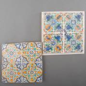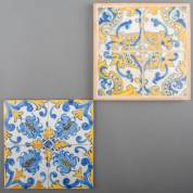 Twee vierpas tegeltableaus: geel-blauw floraal decor, Portugal, 17e eeuw -defecten-, 28 × 27,5 cm