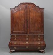 Mahoniegefineerd kabinet met gecontourneerde kap, de onderkast enkelgebogen met schrijfcompartiment, staand op bracket-poten, Hollands, midden 18e eeuw -fineerschade en krimpscheuren-, 240 × 170 × 61 cm