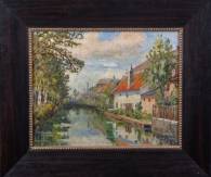 Schilderij: huizen langs een vaart, olieverf op doek, r.o. gesigneerd E. Landberg, 38 × 48 cm