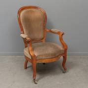 Notenhouten voltaire met grijze bekleding, tweede helft 19e eeuw