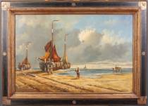 Hollandse School: botters op het strand, olieverf op doek, r.o. gesigneerd N. Jasper, 20e eeuw, 60 × 90 cm