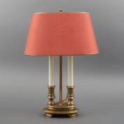 Bronskleurig tweelichts metalen tafellampje met ovaal steenrood kapje, hoogte 49 cm