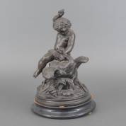 Metalen beeld op houten basement: putti zittend op zwaan -deuk in arm, kleine defecten, basement sleets-, 47 × Ø 26 cm