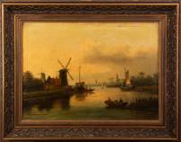 Hollandse School: figuren bij bootjes met molen, olieverf op doek, 19e eeuw, gesigneerd Spohler maar niet van zijn hand -kleine restauratie-, 47 × 65,5 cm