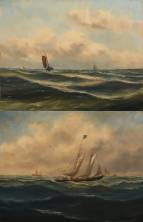 Haaike Abraham Jaarsma (1881-1970), twee schilderijen: beide zeilschepen op zee, olieverf op doek, één r.o. gesigneerd en gedateerd 1975, 54 × 70 cm per stuk