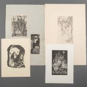 Diverse grafiek: Henk Hester, twee werken, linosnedes, beide gesigneerd; Ru van Royen, 'Tiake Tahiti', ets, eigen druk, r.o. gesigneerd en gedateerd '48, met opdracht 'aan Hans van Dokkum'; en Hans Arkema, twee werken: zelfportret, en 'De hemel geeft: wie vangt, die heeft', beide l.o. gesigneerd 'Arkema Appingedam', afmetingen laatstgenoemde 30 × 22 cm