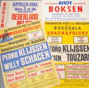 Vier posters: Bokswedstrijden, Ahoy, 1955-1956. (Klyssen - Limage; Klyssen - Touzard; Klyssen - Willy Schagen; landenwedstrijd Nederland-België), 90 × 65 cm; daarbij twee andere posters: 'Groot international speedway-programma op de 500cc motoren, Nederland Engeland'. 1956; 'Stockcar Racing Noordwijk'