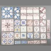 Veertig hele en acht halve aardewerk tegels met diverse ornamentmotieven, waarvan zestien gemonteerd in tableaus, 17e tot-en-met 19e eeuw -randbeschadigingen-, maat tableaus 26 × 26 cm