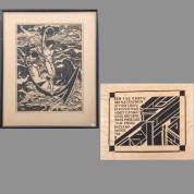 Johan Frederik ten Klooster (1873-1940), 'De overwinnaar', houtsnede, r.o. gesigneerd -roestvlekjes-, 41 × 31 cm, en typografie: 'Een stad is niet de som van straten en uit steen gebouwde huizen maar wordt gemaakt door hen die buiten de muren daarvan treden en elkaar ontmoeten', linosnede, eigen druk 2/2, r.o. onduidelijk gesigneerd en gedateerd 1981, 39 × 49 cm