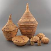 Vier diverse Afrikaanse aardewerk potten op gevlochten standring, daarbij: gevlochten mand op pootjes met deksel en houten dekseldoos, mand 30 × Ø 17 cm