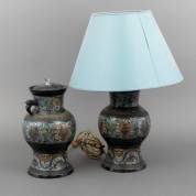 Paar cloisonné lampvoeten, waarvan één met kap -drie oren en één fitting ontbreken-, 55 × Ø 40,5 cm