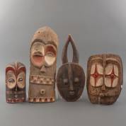 Vier diverse Afrikaanse houten maskers, waaronder: Bembe, Congo, -defecten-, grootste 55 × 21 cm