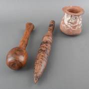 Houten knots met gesneden decor, houten speer-knots, beide Oceanië, en aardewerk Aibom Sago-pot met witte beschildering en twee gezichten, midden-Sepik, Papoea-Nieuw-Guinea, afmetingen pot 17 × Ø 16 cm