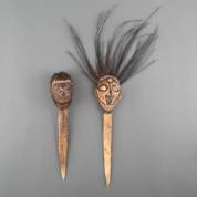 Twee dolken met benen lemmeten en polychroom beschilderde hoofden, beide Sepik, Papoea-Nieuw-Guinea, langste 37 cm exclusief verentooi
