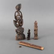 Diverse Aziatische beeldjes: opzittende hond, wachter, en totem, Indonesië en Papoea-Nieuw-Guinea, daarbij: mythologisch verhaal op palmblad