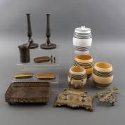 Divers kleingoed: voorraadpotten, twee metalen kandelaars, inktstel drie tabaksdozen, etc., hoogte kandelaars 26 cm