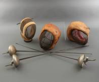 Drie schermmaskers en degens, midden 20e eeuw