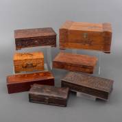 Japans lakwerk handschoenendoos vogel- en bamboedecor, twee Indische houten dozen met pauwendecor, twee Chinese houten dozen met landschapsdecor, Chinese bewerkte doos met goudvissen, en Indiase doos met decor van bladeren en vruchten -minieme defecten-, 20e eeuw, grootste doos 16 × 36 × 24 cm